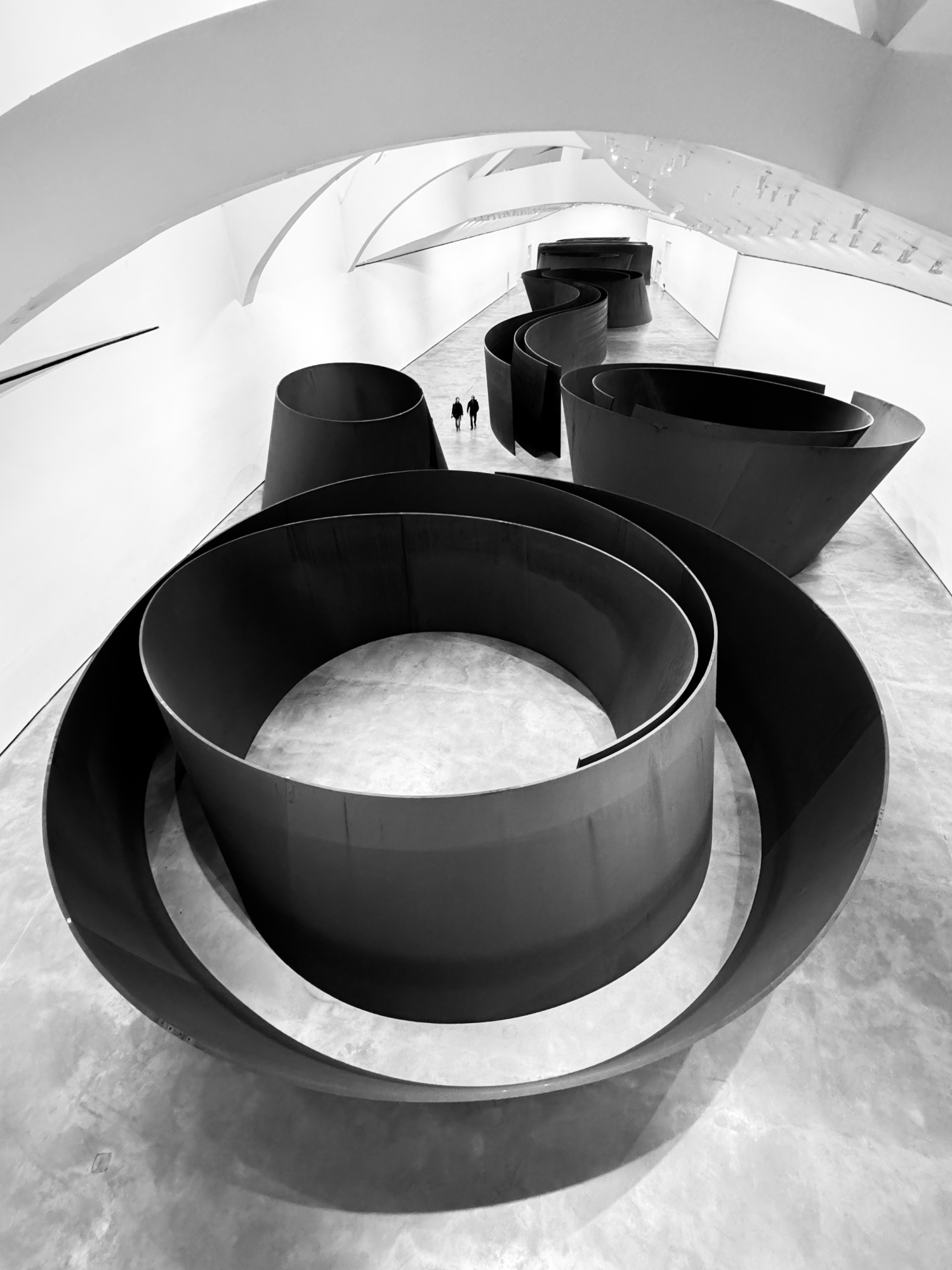 The "Matter of Time" is a monumental installation by American sculptor Richard Serra. Located in the Guggenheim Museum in Bilbao, it consists of massive weathered steel sculptures. From a high point of view, you can see a view from a balcony looking down the room. Waiting long enough, you can make a pleasant street photo of a couple who navigate through twists in time. However, I’m sure other photographers have done this already.