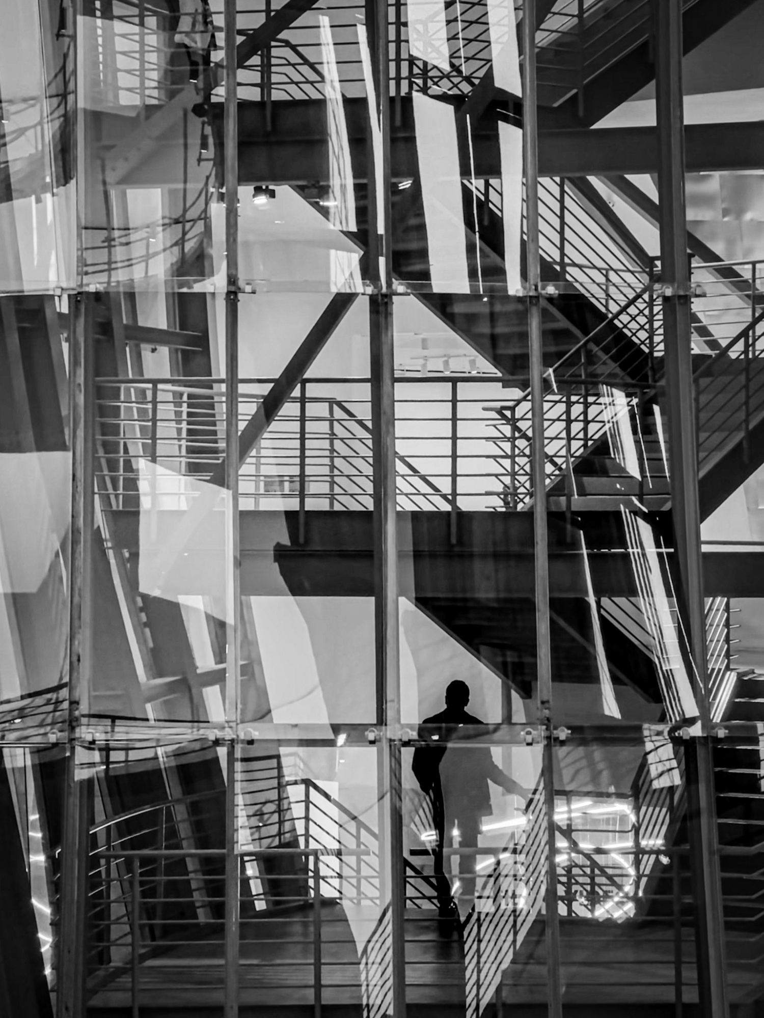 You can also pump up the level of abstraction as I did in the photograph below. The glass and metal structure of the stairways connecting the museum levels was the perfect background for an entangled man.